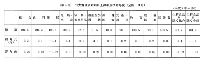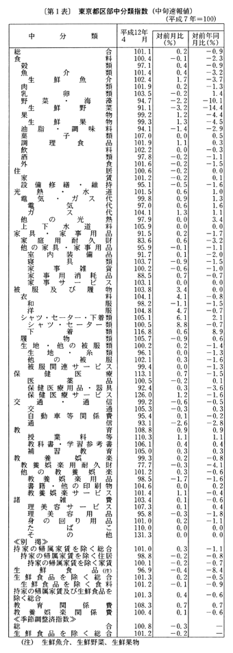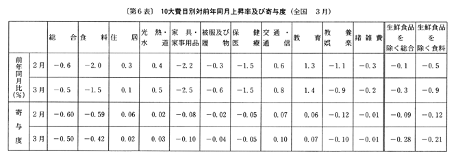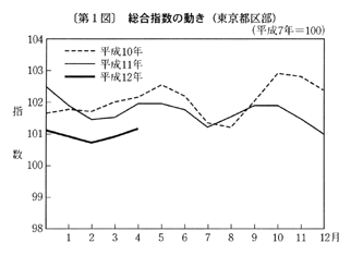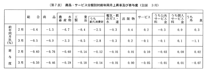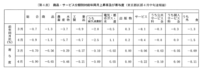 全国の生鮮食品を除く総合は、前年同月比で三月〇・三%の下落の後、四月は家賃の上昇幅の縮小等により〇・四%の下落(前月比〇・二%の上昇、季節調整済前月比〇・二%の下落)となった。なお、総合は、前年同月比で三月〇・五%の下落の後、四月は〇・八%の下落(前月比〇・二%の上昇、季節調整済前月比〇・三%の下落)となった。