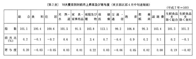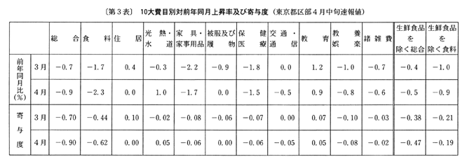 東京都区部の動きでみると、生鮮食品を除く総合は、前年同月比で四月〇・五%の下落の後、五月(中旬速報値)は、個人サービスが保合いから上昇に転じたこと等により〇・四%の下落(前月比〇・二%の上昇、季節調整済前月比保合い)となった。なお、総合は、前年同月比で四月〇・九%の下落の後、五月(中旬速報値)は〇・九%の下落(前月比保合い、季節調整済前月比〇・二%の下落)となった。