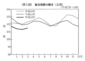 実質国内総生産(平成二年基準、速報)の動向をみると、十一年十〜十二月期前期比一・六%減(年率六・四%減)の後、十二年一〜三月期は同二・四%増(同一〇・〇%増)となった。内外需別にみると、国内需要の寄与度は一・五%となり、財貨・サービスの純輸出の寄与度は〇・九%となった。需要項目別にみると、民間最終消費支出は前期比一・八%増、民間企業設備投資は同四・二%増、民間住宅は同六・六%増となった。公的固定資本形成は前期比七・五%減、政府最終消費支出は同〇・八%増となった。また、財貨・サービスの輸出は前期比五・四%増、財貨・サービスの輸入は同〇・六%減となった。
