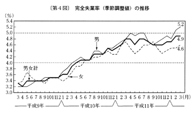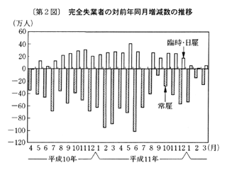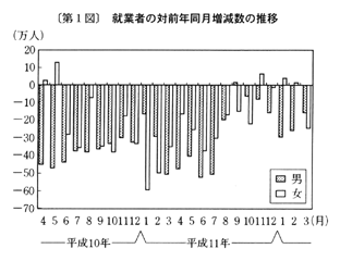 労働力需給をみると、有効求人倍率(季節調整値)は、三月〇・五三倍の後、四月〇・五六倍となった。新規求人倍率(季節調整値)は、三月〇・九七倍の後、四月一・〇二倍となった。総務庁「労働力調査」による雇用者数は、三月は前年同月比〇・四%減(前年同月差二十一万人減)の後、四月は同〇・四%減(同二十三万人減)となった。常用雇用(事業所規模五人以上)は、三月前年同月比〇・一%減(季節調整済前月比〇・一%減)の後、四月(速報)は同〇・四%減(同〇・四%減)となり(事業所規模三十人以上では前年同月比一・四%減)、産業別には製造業では同一・九%減となった。四月の完全失業者数(季節調整値)は、前月差五万人減の三百二十七万人、完全失業率(同)は、三月四・九%の後、四月四・八%となった。所定外労働時間(製造業)は、事業所規模五人以上では三月前年同月比一四・五%増(季節調整済前月比三・八%増)の後、四月(速報)は同一三・一%増(同二・八%減)となっている(事業所規模三十人以上では前年同月比一四・九%増)。また、労働省「労働経済動向調査」(五月調査)によると、「残業規制」などの雇用調整を実施した事業所割合は、引き続き高い水準となっており、一〜三月期は前期の二六%から二五%になった。