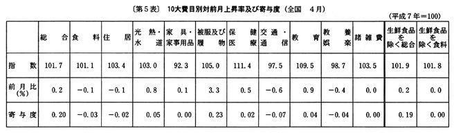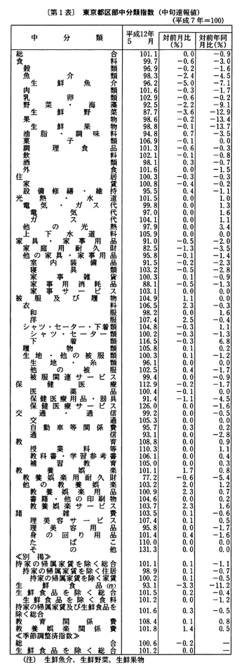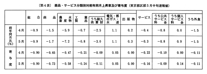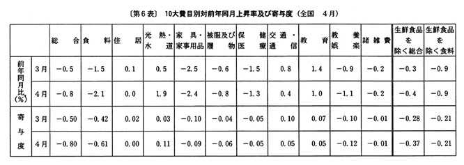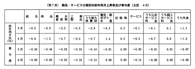 生鮮野菜(一四・三%下落)、外食(一・三%下落)、生鮮魚介(三・四%下落)、家庭用耐久財(五・六%下落)