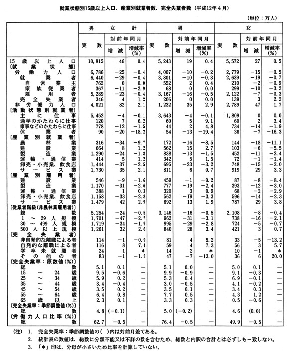 平成十二年四月末の就業状態別人口をみると、就業者は六千四百四十万人、完全失業者は三百四十六万人、非労働力人口は四千二十一万人で、前年同月に比べそれぞれ二十九万人(〇・四%)減、四万人(一・二%)増、八十二万人(二・一%)増となっている。