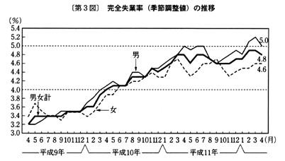 季節調整値でみた完全失業率(労働力人口に占める完全失業者の割合)は四・八%で、前月に比べ〇・一ポイントの低下。男女別にみると、男性は五・〇%、女性は四・六%で、前月に比べ男性は〇・二ポイントの低下、女性は前月と同率となっている。