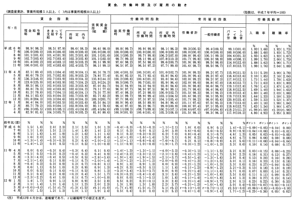 四月の調査産業計の雇用の動きを前年同月比によってみると、常用労働者全体で〇・四%減、常用労働者のうち一般労働者では〇・九%減、パートタイム労働者では一・七%増であった。