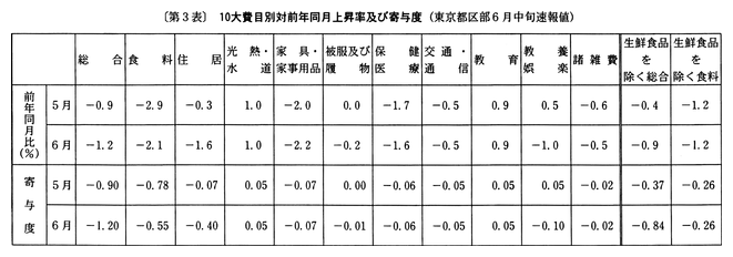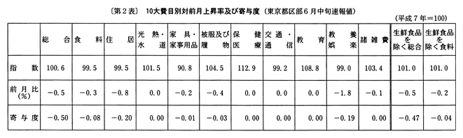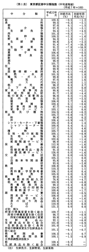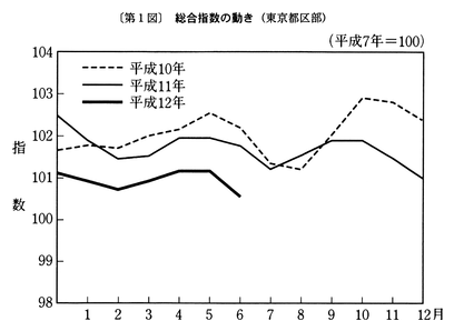 (1) 総合指数は平成七年を一〇〇として一〇〇・六となり、前月比は〇・五%の下落。前年同月比は三月〇・七%の下落、四月〇・九%の下落、五月〇・九%の下落と推移した後、六月は一・二%の下落となった。