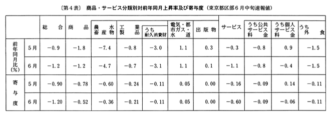 家賃(一・七%下落)、生鮮果物(一六・九%下落)、外食(一・五%下落)、教養娯楽サービス(一・七%下落)