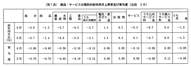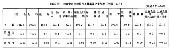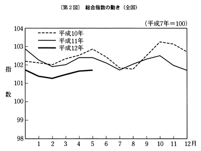 (1) 総合指数は平成七年を一〇〇として一〇一・八となり、前月比は〇・一%の上昇。前年同月比は二月〇・六%の下落、三月〇・五%の下落、四月〇・八%の下落と推移した後、五月は〇・七%の下落となった。