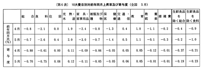 (2) 生鮮食品を除く総合指数は一〇二・二となり、前月比は〇・三%の上昇。前年同月比は二月〇・一%の下落、三月〇・三%の下落、四月〇・四%の下落と推移した後、五月は〇・二%の下落となった。