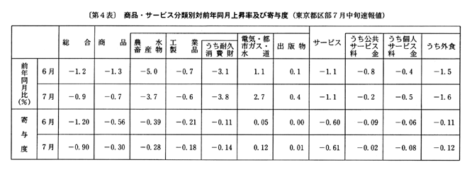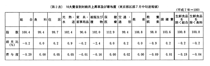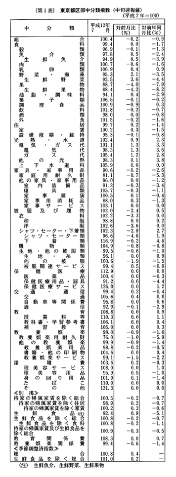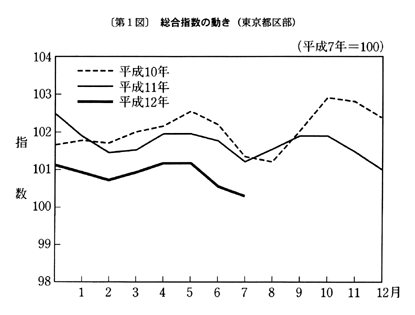 (1) 総合指数は平成七年を一〇〇として一〇〇・四となり、前月比は〇・二%の下落。前年同月比は四月〇・九%の下落、五月〇・九%の下落、六月一・二%の下落と推移した後、七月は〇・九%の下落となった。