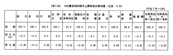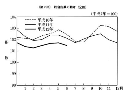 (1) 総合指数は平成七年を一〇〇として一〇一・五となり、前月比は〇・三%の下落。前年同月比は三月〇・五%の下落、四月〇・八%の下落、五月〇・七%の下落と推移した後、六月は〇・七%の下落となった。