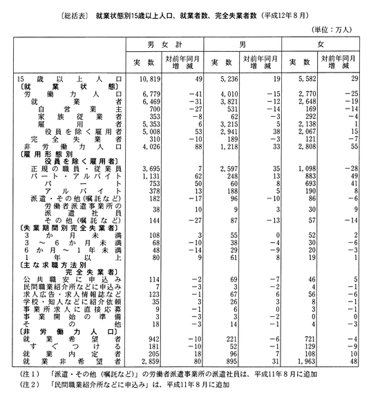▽平成十二年八月 労働力調査特別調査結果の概要……………総 務 庁