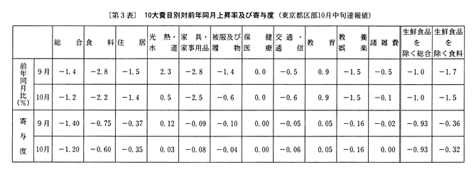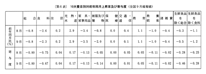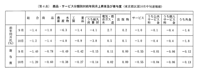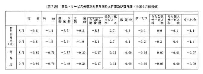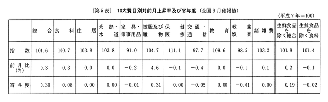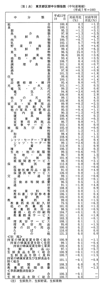 生鮮野菜(一一・〇%下落)、生鮮果物(一一・五%下落)、衣料(三・三%下落)、外食(一・四%下落)