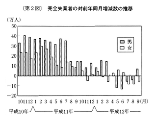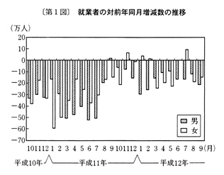 労働力需給をみると、有効求人倍率(季節調整値)は、九月〇・六二倍の後、十月〇・六四倍となった。新規求人倍率(季節調整値)は、九月一・一一倍の後、十月一・一一倍となった。総務庁「労働力調査」による雇用者数は、九月は前年同月比〇・八%増(前年同月差四十二万人増)の後、十月は同一・〇%増(同五十二万人増)となった。常用雇用(事業所規模五人以上)は、九月前年同月比〇・二%減(季節調整済前月比〇・〇%)の後、十月(速報)は同〇・一%減(同〇・〇%)となり(事業所規模三十人以上では前年同月比一・一%減)、産業別には製造業では同一・二%減となった。十月の完全失業者数(季節調整値)は、前月差一万人減の三百十七万人、完全失業率(同)は、九月四・七%の後、十月四・七%となった。所定外労働時間(製造業)は、事業所規模五人以上では九月前年同月比一〇・九%増(季節調整済前月比〇・五%増)の後、十月(速報)は同一〇・〇%増(同一・二%減)となっている(事業所規模三十人以上では前年同月比一一・八%増)。