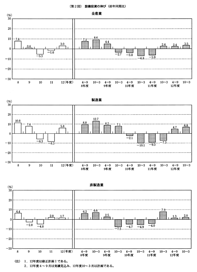 産業別にみると、製造業では、四〜六月期四・八%減の後、七〜九月期は一三・九%増と増加に転じた。他方、非製造業では、四〜六月期四・六%減の後、七〜九月期は六・九%増と増加に転じた。