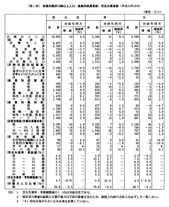 平成十二年十月末の就業状態別人口をみると、就業者は六千五百八万人、完全失業者は三百十四万人、非労働力人口は四千二十万人で、前年同月に比べそれぞれ八万人(〇・一%)増、三万人(一・〇%)増、四十一万人(一・〇%)増となっている。