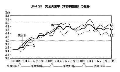 季節調整値でみた完全失業率(労働力人口に占める完全失業者の割合)は四・七%で、前月と同率になっている。男女別にみると、男性は四・九%、女性は四・三%で、男性は〇・一ポイントの上昇、女性は〇・二ポイントの低下となっている。
