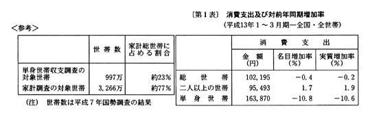 家計総世帯の勤労者以外の世帯の消費支出は、一人当たり九万七千六百六十二円となり、前年同期に比べ、名目一・〇%の減少、実質〇・八%の減少となった。
