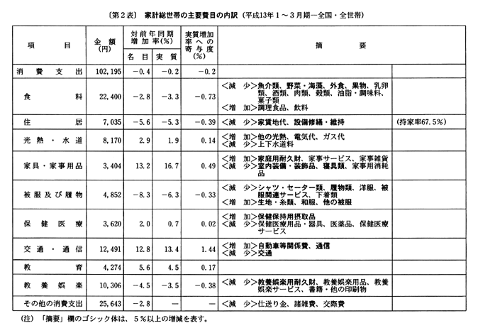 家計総世帯の全世帯の消費支出は、一人当たり十万二千百九十五円となり、前年同期に比べ、名目〇・四%の減少、実質〇・二%の減少となった。