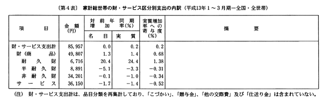 半耐久財、非耐久財は実質減少したものの、耐久財が実質増加したことから、財(商品)全体では、実質一・四%の増加となった。
