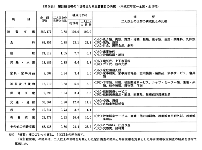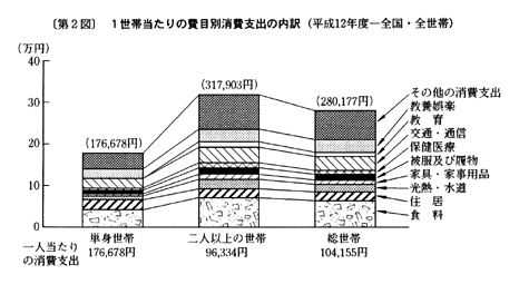平成十二年度の家計総世帯の全世帯一か月平均消費支出は、一世帯当たり二十八万百七十七円となり、二人以上の世帯の一か月平均消費支出(三十一万七千九百三円)の〇・八八倍、単身世帯の一か月平均消費支出(十七万六千六百七十八円)の一・五九倍となった。
