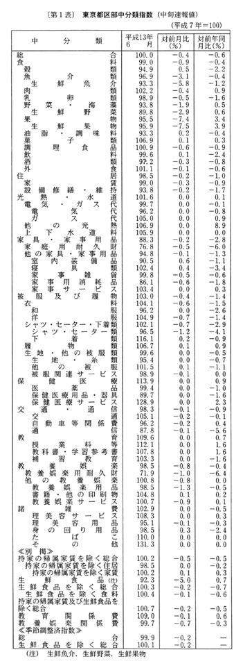 (1) 総合指数は平成七年を一〇〇として一〇〇・〇となり、前月比は〇・四%の下落。前年同月比は三月〇・九%の下落、四月〇・九%の下落、五月〇・七%の下落と推移した後、六月は〇・六%の下落となった。
