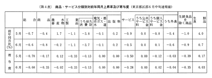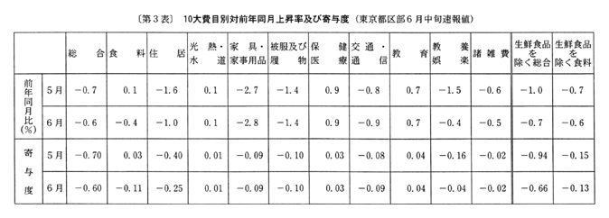 (2) 生鮮食品を除く総合指数は一〇〇・三となり、前月比は〇・二%の下落。前年同月比は三月一・一%の下落、四月〇・九%の下落、五月一・〇%の下落と推移した後、六月は〇・七%の下落となった。