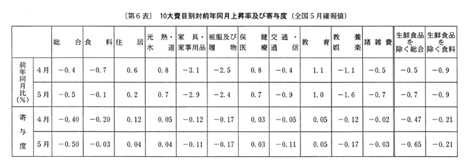 家賃(〇・九%下落)、通信(五・六%下落)、家庭用耐久財(六・〇%下落)、シャツ・セーター・下着類(二・九%下落)