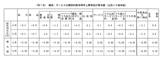 (2) 生鮮食品を除く総合指数は一〇一・五となり、前月比は〇・一%の上昇。前年同月比は二月〇・六%の下落、三月〇・六%の下落、四月〇・五%の下落と推移した後、五月は〇・七%の下落となった。