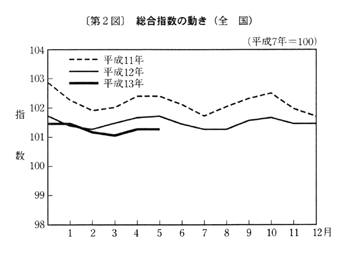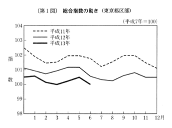 (1) 総合指数は平成七年を一〇〇として一〇一・三となり、前月と同水準。前年同月比は二月〇・一%の下落、三月〇・四%の下落、四月〇・四%の下落と推移した後、五月は〇・五%の下落となった。