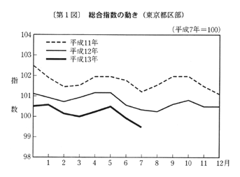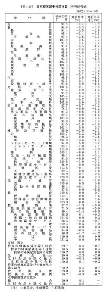 (1) 総合指数は平成七年を一〇〇として九九・五となり、前月比は〇・四%の下落。前年同月比は四月〇・九%の下落、五月〇・七%の下落、六月〇・七%の下落と推移した後、七月は〇・九%の下落となった。