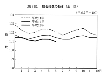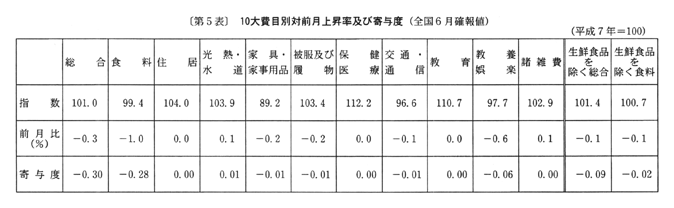 (1) 総合指数は平成七年を一〇〇として一〇一・〇となり、前月比は〇・三%の下落。前年同月比は三月〇・四%の下落、四月〇・四%の下落、五月〇・五%の下落と推移した後、六月は〇・五%の下落となった。