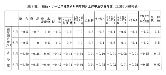 (2) 生鮮食品を除く総合指数は一〇一・四となり、前月比は〇・一%の下落。前年同月比は三月〇・六%の下落、四月〇・五%の下落、五月〇・七%の下落と推移した後、六月は〇・六%の下落となった。