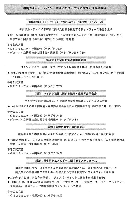 二〇〇〇年には、日本を含むG8諸国が議論をリードしてきた、国連国際組織犯罪条約及び関連二議定書の交渉が妥結し、国際組織犯罪と戦うための法的枠組を包括的に定める初めての多数国間条約が採択された。また、九州・沖縄サミットで大きく取り上げられた感染症については、日本は、十二月、感染症対策沖縄国際会議を開催し、国際的な具体的行動計画を策定した。地球温暖化問題については、オランダで開催された気候変動枠組条約第六回締約国会議(COP6)では合意に至らず、国際社会の更なる取組が必要とされている。二十一世紀の国際的な協調行動を導く理念として「人間の安全保障」を掲げる日本は、様々な分野での地球規模の諸問題に積極的に取り組み、国際社会の協調をリードしていくことが求められている。