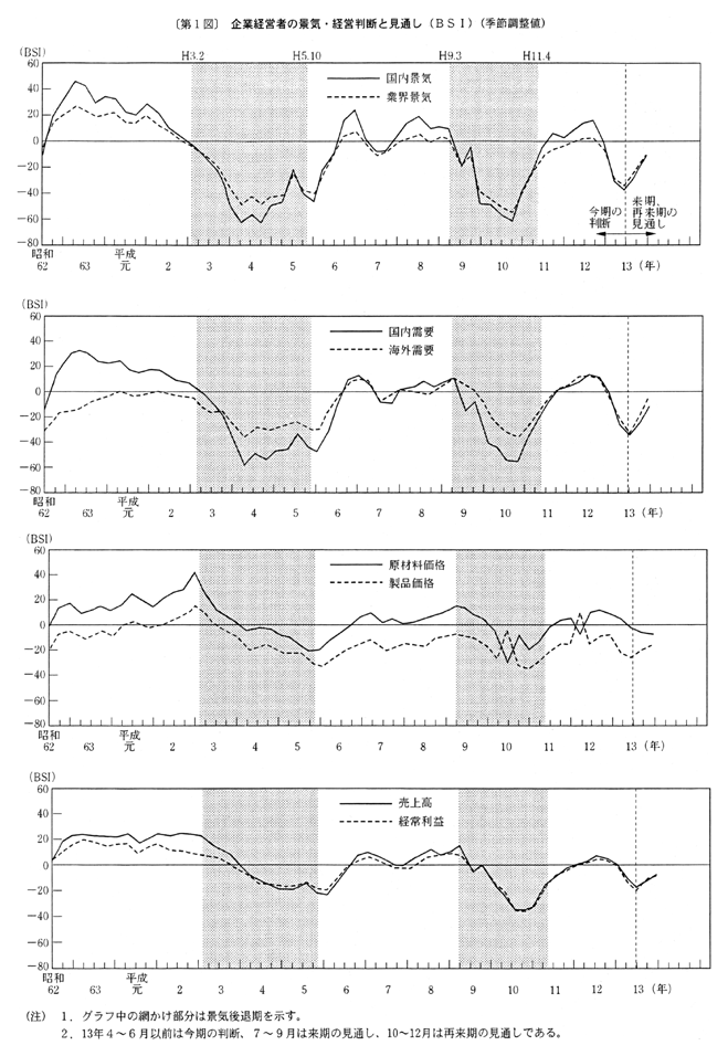 (1) 今期三か月の判断とは平成十三年一〜三月期と比較した場合の十三年四〜六月期の判断、来期三か月の見通しとは十三年四〜六月期と比較した場合の十三年七〜九月期の見通し、再来期三か月の見通しとは十三年七〜九月期と比較した場合の十三年十〜十二月期の見通しである。ただし、在庫水準と生産設備については、それぞれの調査期間における判断と見通しである。