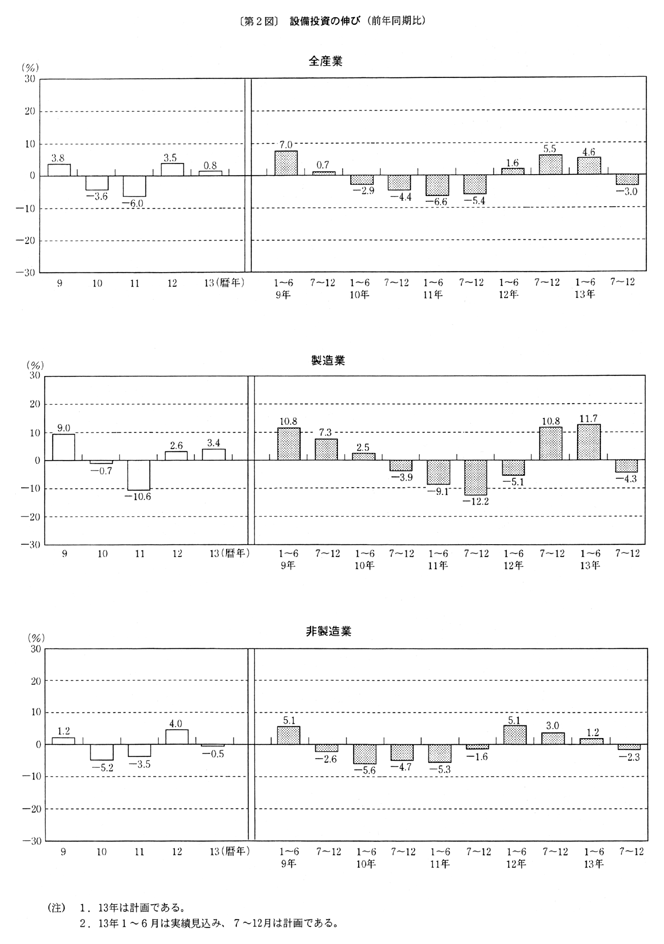 (2) 第1図、第1〜8表の十三年四〜六月以前は今期の判断、十三年七〜九月は来期の見通し、十三年十〜十二月は再来期の見通しである。