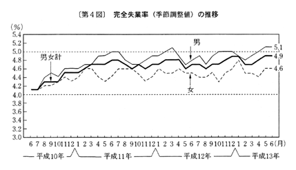 季節調整値でみた完全失業率(労働力人口に占める完全失業者の割合)は四・九%で前月と同率となっている。男女別にみると、男性は五・一%、女性は四・六%と、前月に比べ男性、女性とも同率となっている。