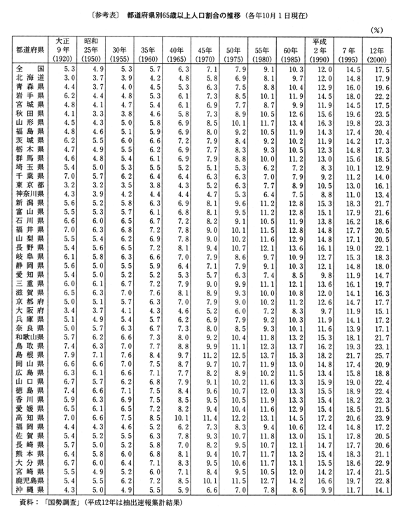 (1) 総人口に占める六十五歳以上人口の割合の推移をみると、第一回国勢調査が行われた大正九年以降、昭和二十五年頃までは五・〇%程度で推移していたが、その後は年を追って上昇し、六十年には総人口の一〇・三%と一〇・〇%を超えて、総人口の十人に一人を占めるようになった。この割合は近年では毎年〇・五ポイント程度上昇しており、平成十三年には一七・九%となり、総人口の五・六人に一人の割合となっている(第2表、第1図参照)。
