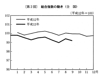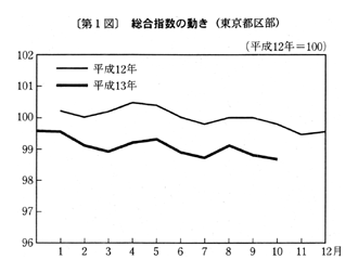 (1) 総合指数は平成十二年を一〇〇として九八・七となり、前月比は〇・一%の下落。前年同月比は一・一%の下落となった。