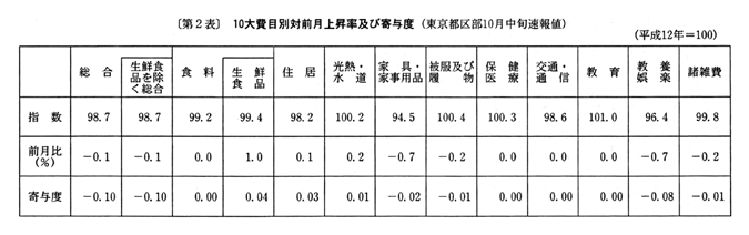 (2) 生鮮食品を除く総合指数は九八・七となり、前月比は〇・一%の下落。前年同月比は一・〇%の下落となった。