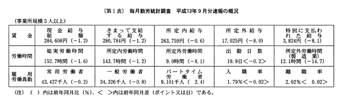 (注) 九月末一週間(二十四〜三十日)の就業時間は、平成十二年九月末と平日の日数の違いによる影響があるので注意を要する。