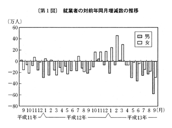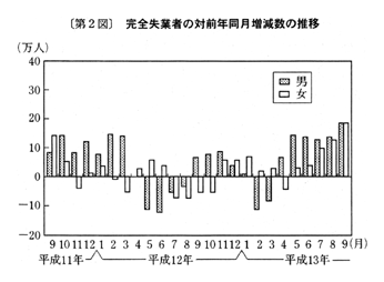 完全失業者数は比較可能な昭和二十八年以降最高の三百五十七万人と、前年同月に比べ三十七万人(一一・六%)増となり、六か月連続の増加となっている。男女別にみると、男性は二百十二万人、女性は百四十五万人で、前年同月に比べ、男性は十九万人(九・八%)の増加、女性は十九万人(一五・一%)の増加となっている。