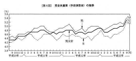 季節調整値でみた完全失業率(労働力人口に占める完全失業者の割合)は五・三%と前月に比べ〇・三ポイントの上昇となっている。男女別にみると、男性は五・四%、女性は五・二%と、前月に比べ男性は〇・三ポイントの上昇、女性は〇・四ポイントの上昇となっている。