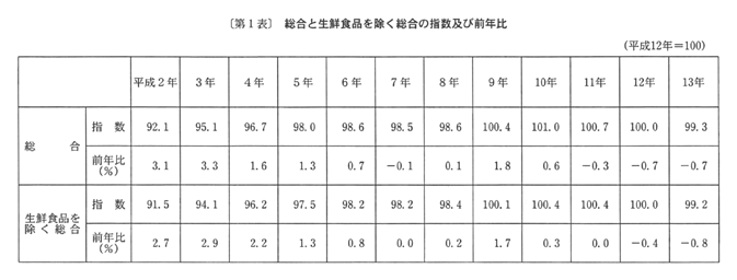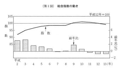平成十三年は、耐久消費財や食料工業製品などの工業製品が下落したことなどにより〇・七%の下落となった。