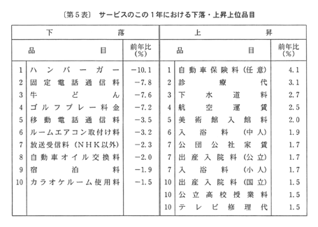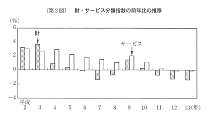 なお、サービスが二年連続して下落したのは、比較可能な昭和四十六年以降初めてのことである。