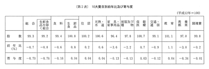 (2) 十大費目指数の動きを前年比でみると、家具・家事用品は家庭用耐久財などの値下がりにより三・六%の下落、被服及び履物は衣料などの値下がりにより二・二%の下落、交通・通信は通信の値下がりにより〇・九%の下落、教養娯楽は教養娯楽用耐久財などの値下がりにより三・〇%の下落とそれぞれ総合の下落より大きな下落となった。このほか、食料は穀類や外食などの値下がりにより〇・六%の下落、諸雑費は理美容用品などの値下がりにより〇・二%の下落となった。一方、住居は家賃の値上がりにより〇・二%の上昇、光熱・水道は上下水道料などの値上がりにより〇・六%の上昇、保健医療は保健医療サービスの値上がりにより〇・七%の上昇、教育は授業料等などの値上がりにより一・一%の上昇となった。