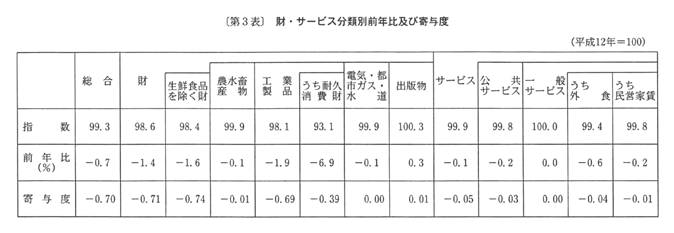 (3) 財・サービス分類指数の動きを前年比でみると、財は一・四%の下落となった。これは、耐久消費財や食料工業製品などの値下がりにより工業製品が一・九%下落したことなどによる。また、サービスは〇・一%の下落となった。これは、外食が〇・六%下落、固定電話通信料などの公共サービスが〇・二%下落したことなどによる。