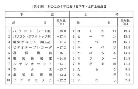 (1) 財の品目別価格指数の前年比について、下落幅の大きい順に並べてみると、上位十品目中、耐久消費財が九品目を占めている。一方、上昇幅の大きい順に並べてみると、上位十品目中、生鮮野菜が六品目を占めている。