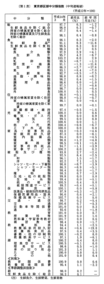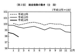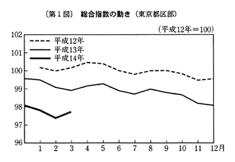 (1) 総合指数は平成十二年を一〇〇として九七・七となり、前月比は〇・三%の上昇。前年同月比は一・二%の下落となった。