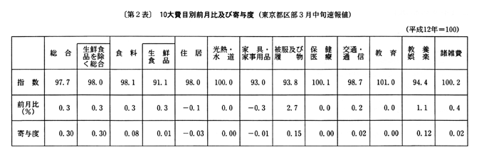 (2) 生鮮食品を除く総合指数は九八・〇となり、前月比は〇・三%の上昇。前年同月比は〇・七%の下落となった。