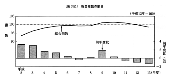 (1) 総合指数は平成十二年を一〇〇として九八・五となり、前年度比は一・三%の下落となった。
